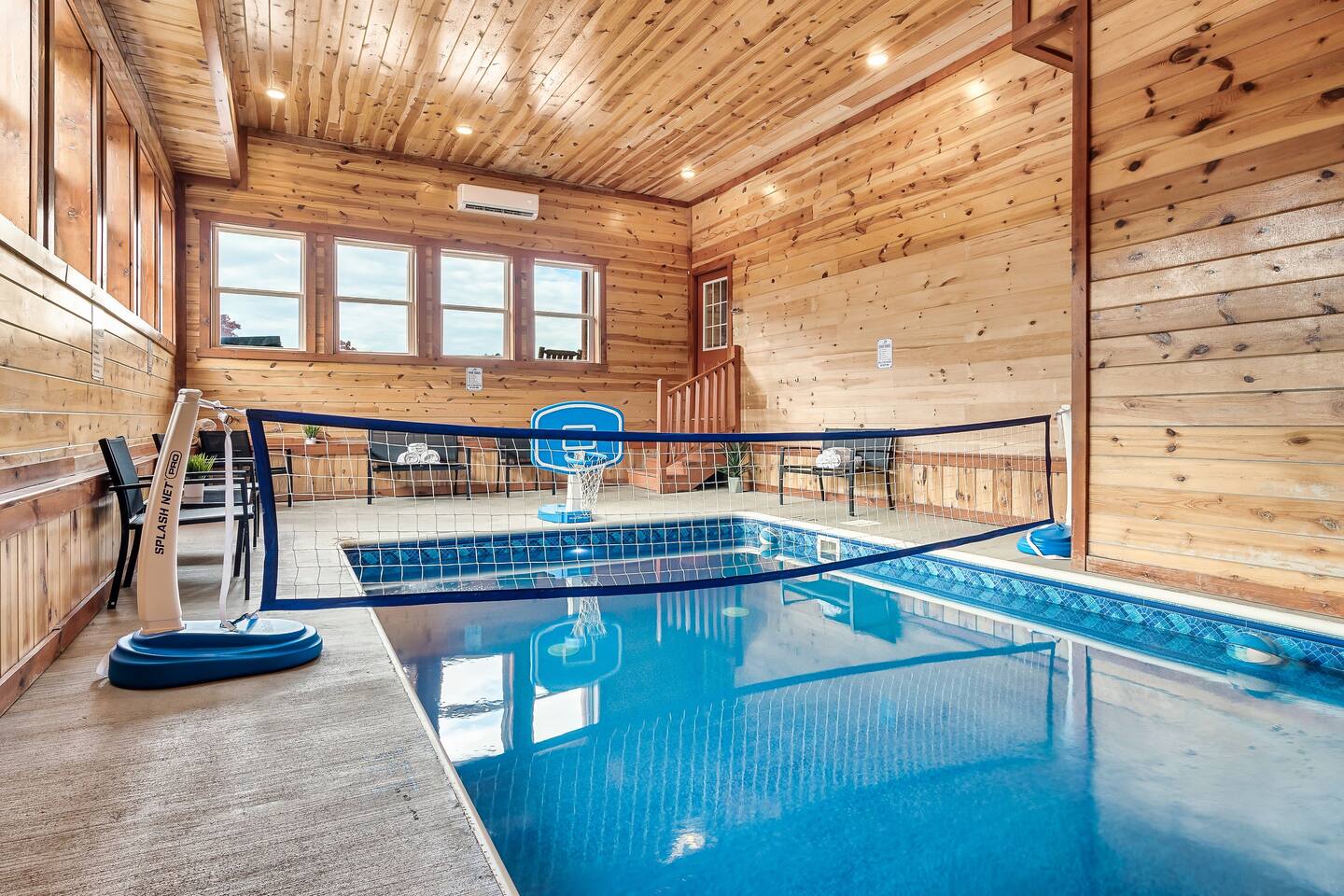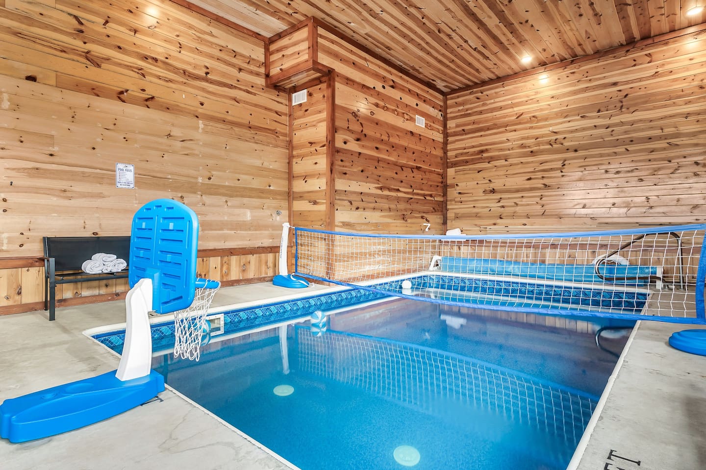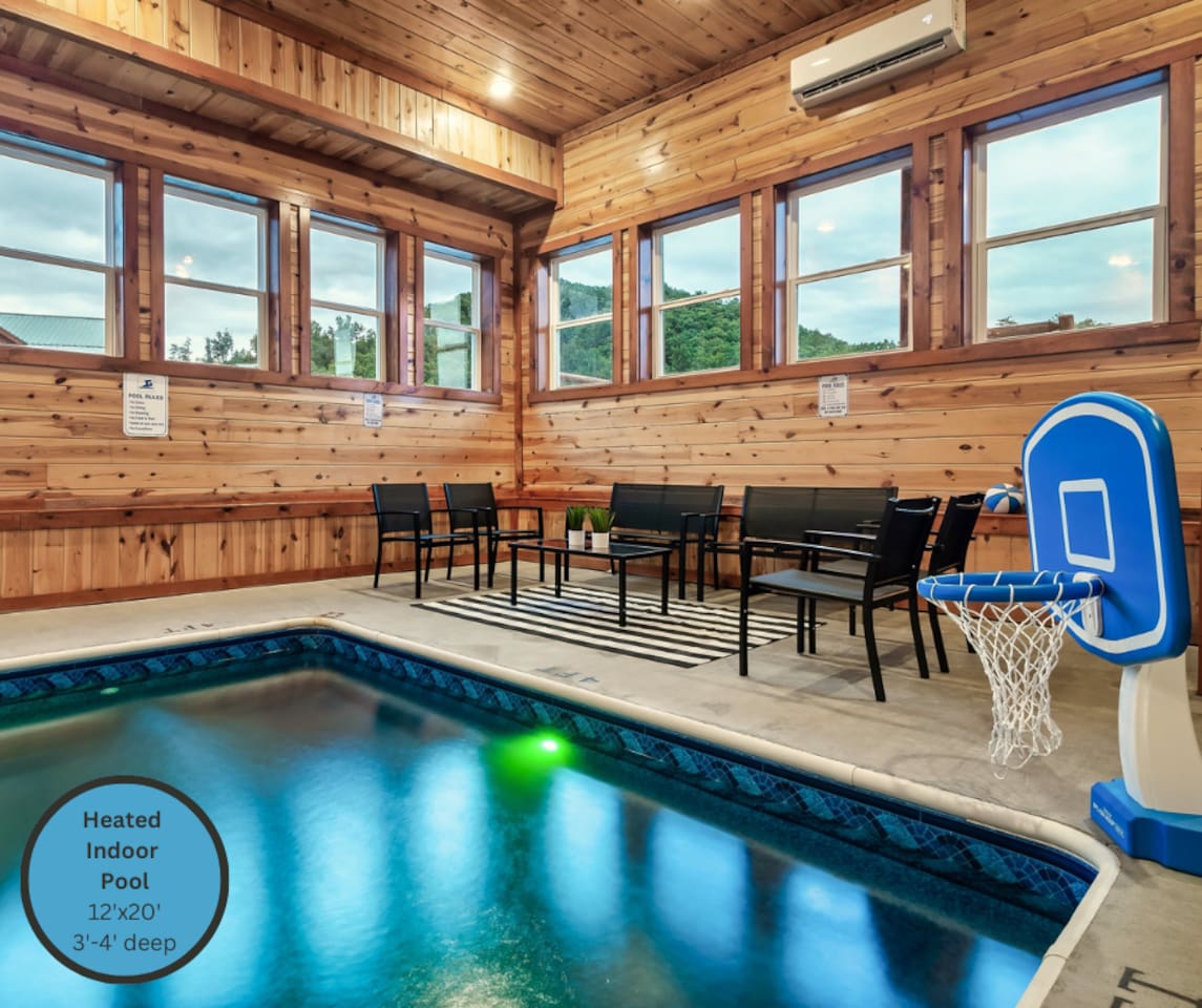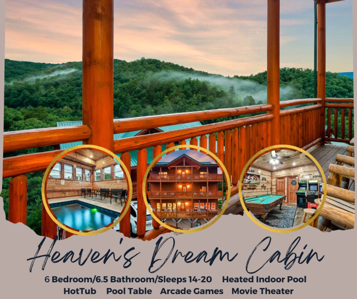 Welcome to Heaven’s Dream Cabin located in Sevierville, TN. Check us out on our website and social media for additional cabin information and videos. Nestled within the tranquil Smoky Mountain Ridge Resort, this exquisitely decorated 3-story mountain retreat offers the ultimate blend of convenience and rustic charm. Located just off the beaten path, you'll find yourself immersed in the serene beauty of the Smoky Mountains while still enjoying easy access to nearby towns. Step inside this recently updated cabin and be prepared to be amazed. With three decks offering breathtaking panoramic views, you'll have the perfect vantage point to soak in the natural splendor that surrounds you. And that's not all - this cabin is packed with all the premiere amenities you could ever dream of. No matter the season, you can take a dip in the heated indoor pool, maintained at a comfortable temperature between 75-80 degrees. Relax and rejuvenate as you enjoy the soothing waters, regardless of the weather outside. With six master suites, there's no shortage of space for everyone to rest and recharge. Comfortably accommodating up to 12 guests, this cabin ensures that everyone has their own private sanctuary to retreat to after a day of adventures. But the fun doesn't stop there! The game room beckons with a pool table and arcade games, providing hours of entertainment for the whole family. And for the ultimate movie night experience, retreat to the private media room, complete with an incredible 85 inch HDTV that will transport you right into the heart of the action. Prepare yourself for an unforgettable stay at this mountain retreat, where comfort, luxury, and natural beauty merge to create an experience you'll cherish forever. This prime location is close to all restaurants and attractions: Pigeon Forge Parkway (4 miles, approximately 5 minutes), Dollywood (9 miles, approximately 19 minutes), Gatlinburg (15 miles, approximately 30 minutes), Great Smoky Mountains National Park (16 miles, approximately 30 minutes). **PLEASE READ THIS ENTIRE SECTION, OTHER THINGS TO NOTE, AND HOUSE RULES BEFORE BOOKING** FLOORPLAN **This is a 3-level cabin. There are plenty of stairs. There are no bedrooms/bathrooms on the main level (see floor plan). GROUND LEVEL: parking, kitchen, living room with electric fireplace, pool, hot tub, deck with outdoor seating, propane grill, high chair (There is no bedroom or bathroom on the ground level) SECOND FLOOR: 1 king bedroom with bathroom with twin rollaway bed (shower only), 2 twin/twin bunk bedroom with bathroom (shower/tub combo) with twin rollaway bed; game room with pool table, arcade, media room, W/D laundry, deck with outdoor seating, pack-n-play THIRD FLOOR: 4 king bedrooms with full bathrooms, each have a twin rollaway bed, workspace, deck with outdoor seating, pack-n-play